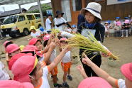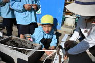 ワラ運んでいます。をスイカやキュウリの苗に敷こう |