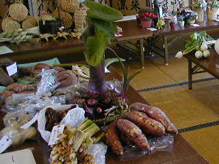 「農産物品評会」の会場です。 ...どれが「紫芋もち」の原料かな。。。??? |