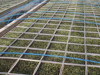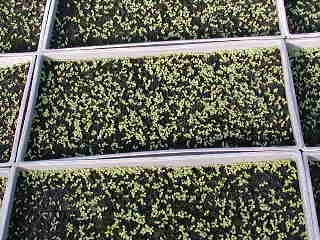 共同育苗センターの「葉たばこ苗」です。 (平成16年2月16日撮影) 2月20日と21日に、「間引き」を予定しております。 |