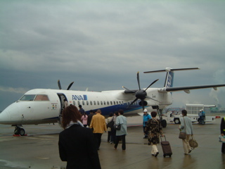 このプロペラ機で大阪(伊丹空港)へ向かいました。 雨だったのですが、定刻のフライトでした。。。@@; |