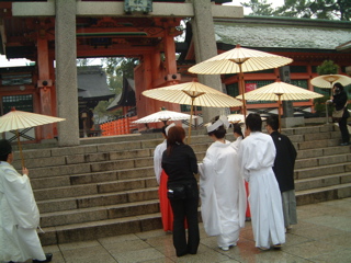 本殿前の門に到着した「花婿」と「花嫁」です。 付き人が「花嫁」の世話をしておられましたが、 雨で大変そうでした。 |