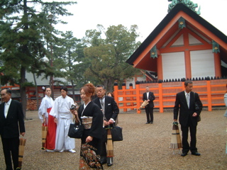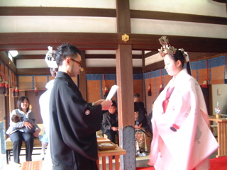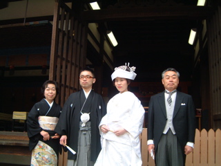 控え室を出て、本殿へ向かう「花婿」と「花嫁」です。 花婿は緊張してるかな?って思ったのですが、 そうでもなったようです。。。@@; |