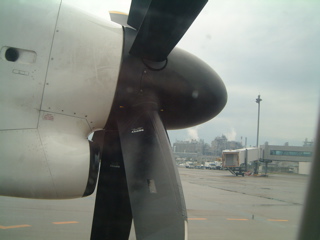 機内から見た「プロペラ」です。 辛抱仕切れなくはないのですが、ジェット機よりは音が 高いです。。。(汗) |