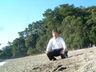 <ここから2日目です。> 桂浜にて、、、私で〜す。。。^^; 前夜のアルコールが多少残ってるものの よく眠ったので頭はスッキリしてます。。。^^ |
