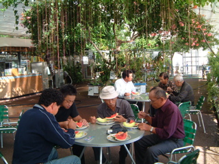 西島園芸で収穫したばかりの「メロン」と 「スイカ」を 試食しているところです。 |